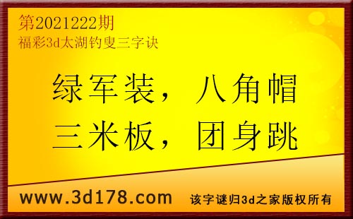3d第21222期太湖字谜:绿军装,八角帽,三米板,团身跳