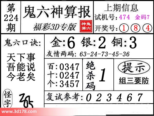 3d第21224期鬼六神算报为您推荐鬼六口诀: