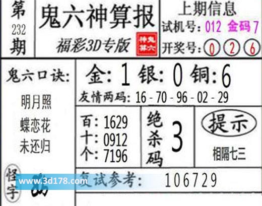 3d第21232期鬼六神算报为您推荐鬼六口诀: