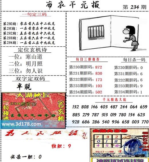 福彩3d布衣图库布衣千元报第2021234期定位玄机诗: