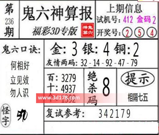 3d第21236期鬼六神算报为您推荐鬼六口诀: