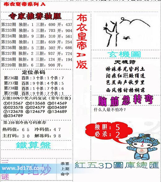 福彩3d第2021239期布衣皇帝A版布衣专家独家推荐: