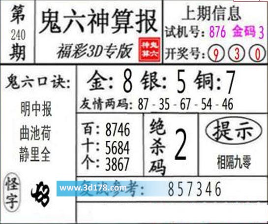 3d第21240期鬼六神算报为您推荐鬼六口诀: