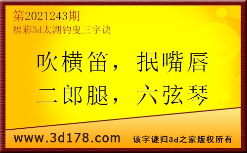 3d第21243期太湖字谜:吹横笛,抿嘴唇,二郎腿,六弦琴