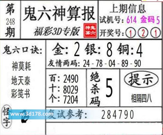 3d第21248期鬼六神算报为您推荐鬼六口诀: