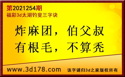 3d第21254期太湖字谜:炸麻团,伯父叔,有根毛,不算秃