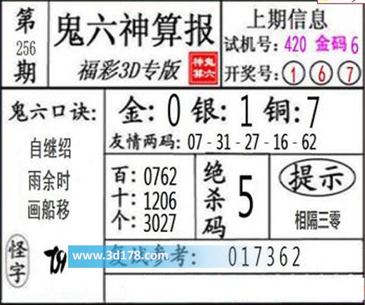 3d第21256期鬼六神算报为您推荐鬼六口诀: