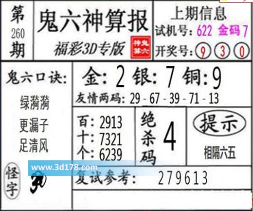 3d第21260期鬼六神算报为您推荐鬼六口诀: