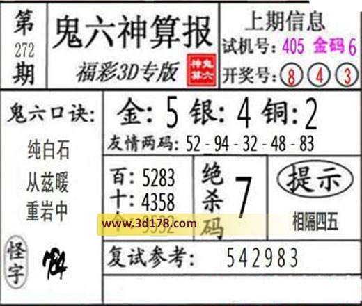 3d第21272期鬼六神算报为您推荐鬼六口诀: