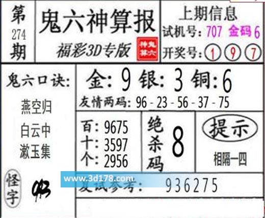 3d第21274期鬼六神算报为您推荐鬼六口诀: