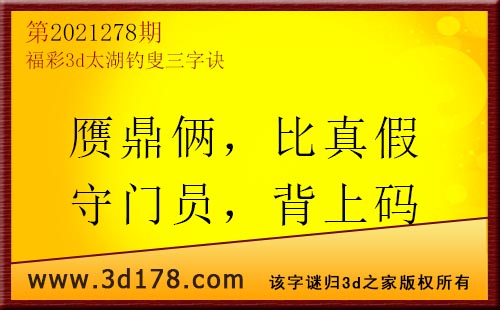 3d第21278期太湖字谜:赝鼎俩,比真假,守门员,背上码