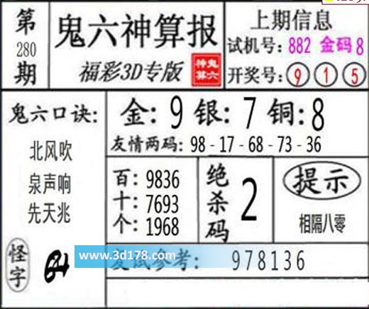 3d第21280期鬼六神算报为您推荐鬼六口诀: