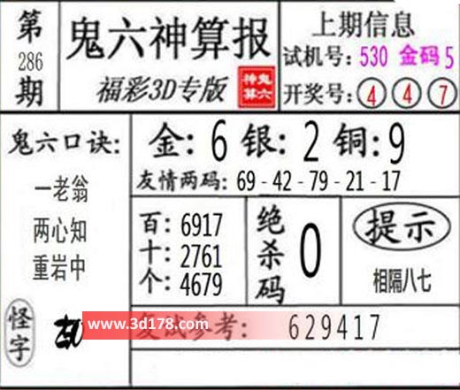 3d第21286期鬼六神算报为您推荐鬼六口诀: