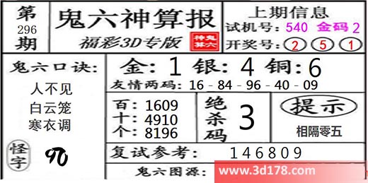 3d第21296期鬼六神算报为您推荐鬼六口诀: