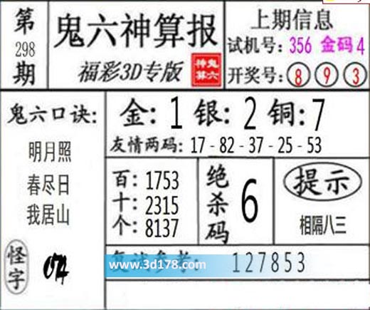 3d第21298期鬼六神算报为您推荐鬼六口诀: