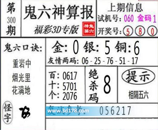 3d第21300期鬼六神算报为您推荐鬼六口诀:
