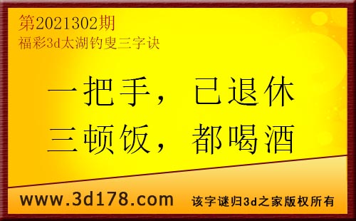 3d第21302期太湖字谜:一把手,已退休,三顿饭,都喝酒