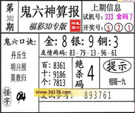 3d第21302期鬼六神算报为您推荐鬼六口诀: