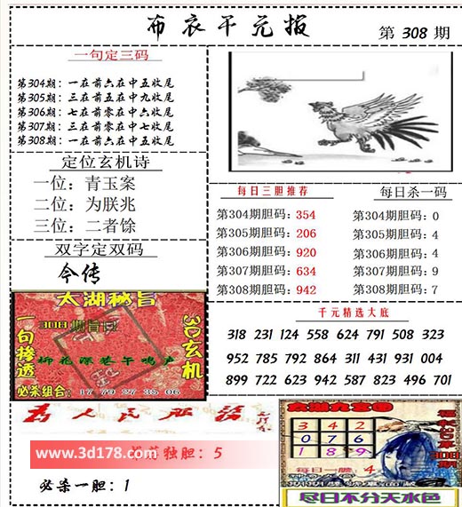 福彩3d布衣图库布衣千元报第2021308期定位玄机诗: