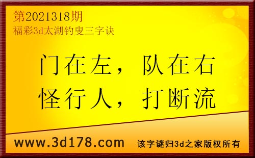 3d第2021318期太湖字谜:门在左,队在右,怪行人,打断流