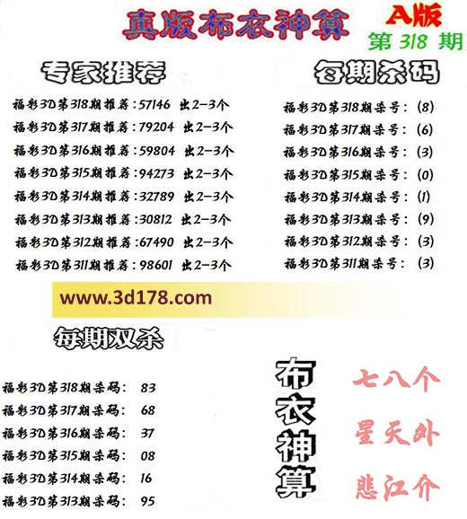 3d布衣神算第318期定位杀码: