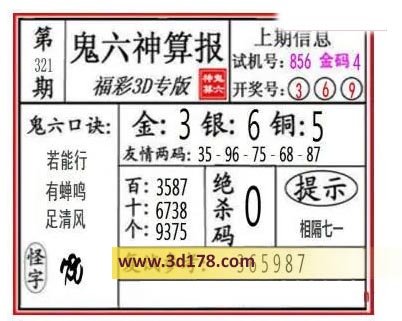 3d第21321期鬼六神算报为您推荐鬼六口诀:
