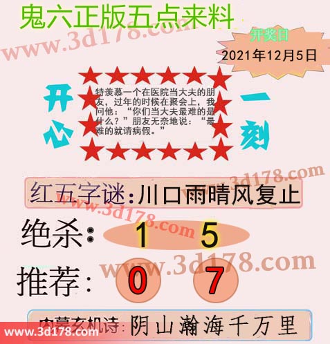 福彩3d第2021325期鬼六五点来料: