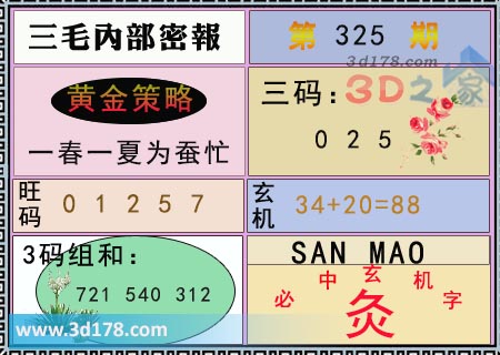 福彩3d第21325期三毛内部密报综合推荐如下: