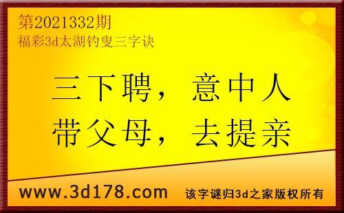 3d第2021332期太湖字谜:三下聘,意中人,带父母,去提亲