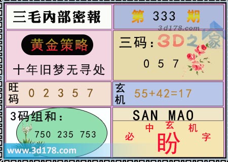 福彩3d第21333期三毛内部密报综合推荐如下: