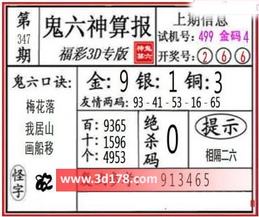 3d第21347期鬼六神算报为您推荐鬼六口诀: