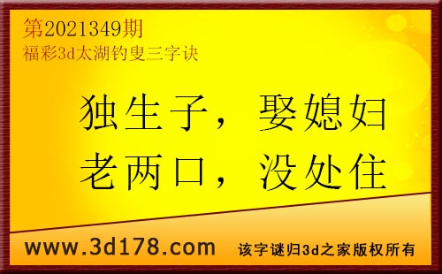 3d第21349期太湖字谜:独生子,娶媳妇,老两口,没处住
