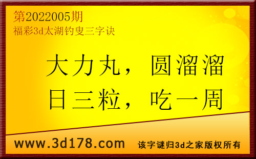 3d第22005期太湖字谜:大力丸,圆溜溜,日三粒,吃一周