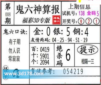 3d第22008期鬼六神算报为您推荐鬼六口诀: