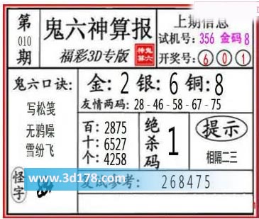 3d第22010期鬼六神算报为您推荐鬼六口诀:
