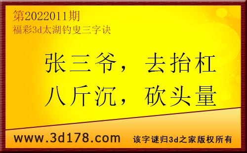 3d第22011期太湖字谜:张三爷,去抬杠,八斤沉,砍头量