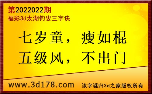 3d第22022期太湖字谜:七岁童,瘦如棍,五级风,不出门