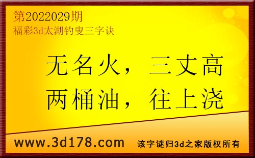 3d第22029期太湖字谜:无名火,三丈高,两桶油,往上浇