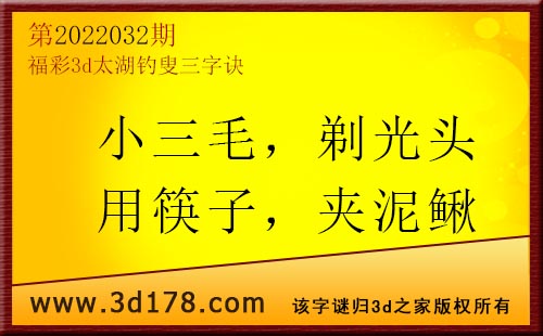 3d第22032期太湖字谜:小三毛,剃光头,用筷子,夹泥鳅