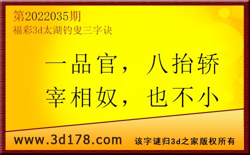 3d第22035期太湖字谜:一品官,八抬轿,宰相奴,也不小