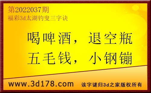 3d第22037期太湖字谜:喝啤酒,退空瓶,五毛钱,小钢镚