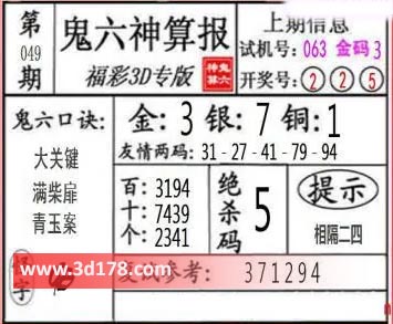 3d第22049期鬼六神算报为您推荐鬼六口诀: