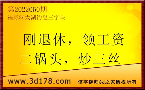 3d第22050期太湖字谜:刚退休,领工资,二锅头,炒三丝