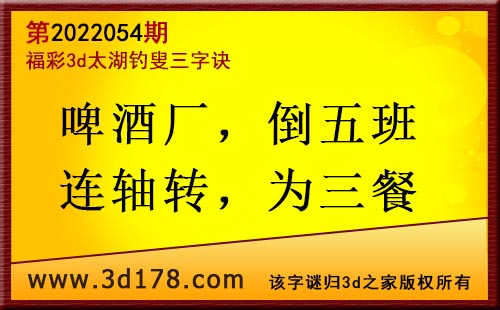 3d第22054期太湖字谜:啤酒厂,倒五班,连轴转,为三餐