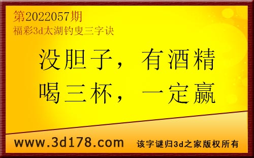 3d第22057期太湖字谜:没胆子,有酒精,喝三杯,一定赢