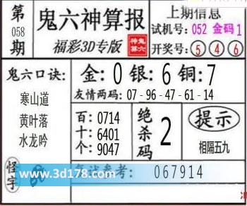 3d第22058期鬼六神算报为您推荐鬼六口诀:
