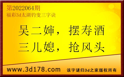 3d第22064期太湖字谜:吴二婶,摆寿酒,三儿媳,抢风头