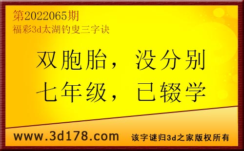 3d第22065期太湖字谜:双胞胎,没分别,七年级,已辍学