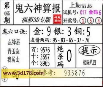 3d第22065期鬼六神算报为您推荐鬼六口诀: