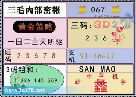 福彩3d第22067期三毛内部密报综合推荐如下: